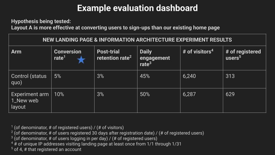 For example, a strong hypothesis might be: “Layout A is more effective at converting users to sign-ups than our existing home page” and your success metrics will help reveal the effect of that change: